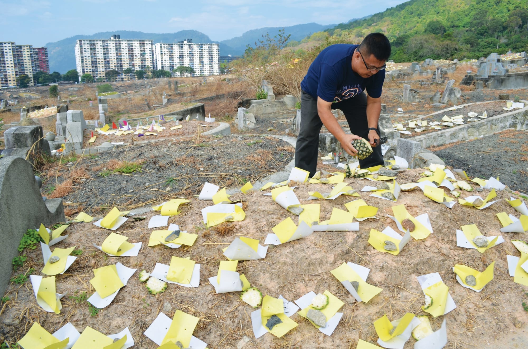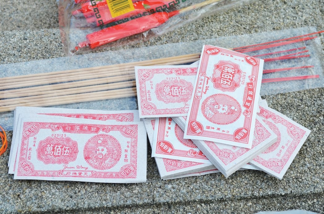 Hell notes are a form of joss paper used as offerings to the deceased, practiced by the Chinese and in other Asian religious and ancestor worship ceremonies. Given the amount of hell notes burnt during Qing Ming, one has to wonder about the inflation rate in the afterlife.Pineapples are sliced and spread across the grave. Some believe that the pineapple is an auspicious fruit, as its Hokkien pronunciation “ong lai” also means “ushering in luck/fortune”.